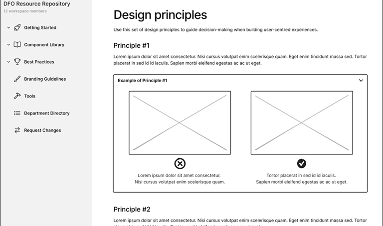 A low-fidelity wireframe of the design repository’s “Design Principles” page.