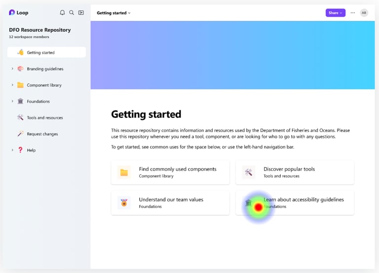 This helped us identify how effective the position, labelling and functionality of features are on the page. For instance, the quick links on the Getting Started page was used by most participants to find accessibility guidelines. This informed us that users may benefit from having access to commonly-needed features in the design repository through quick links.