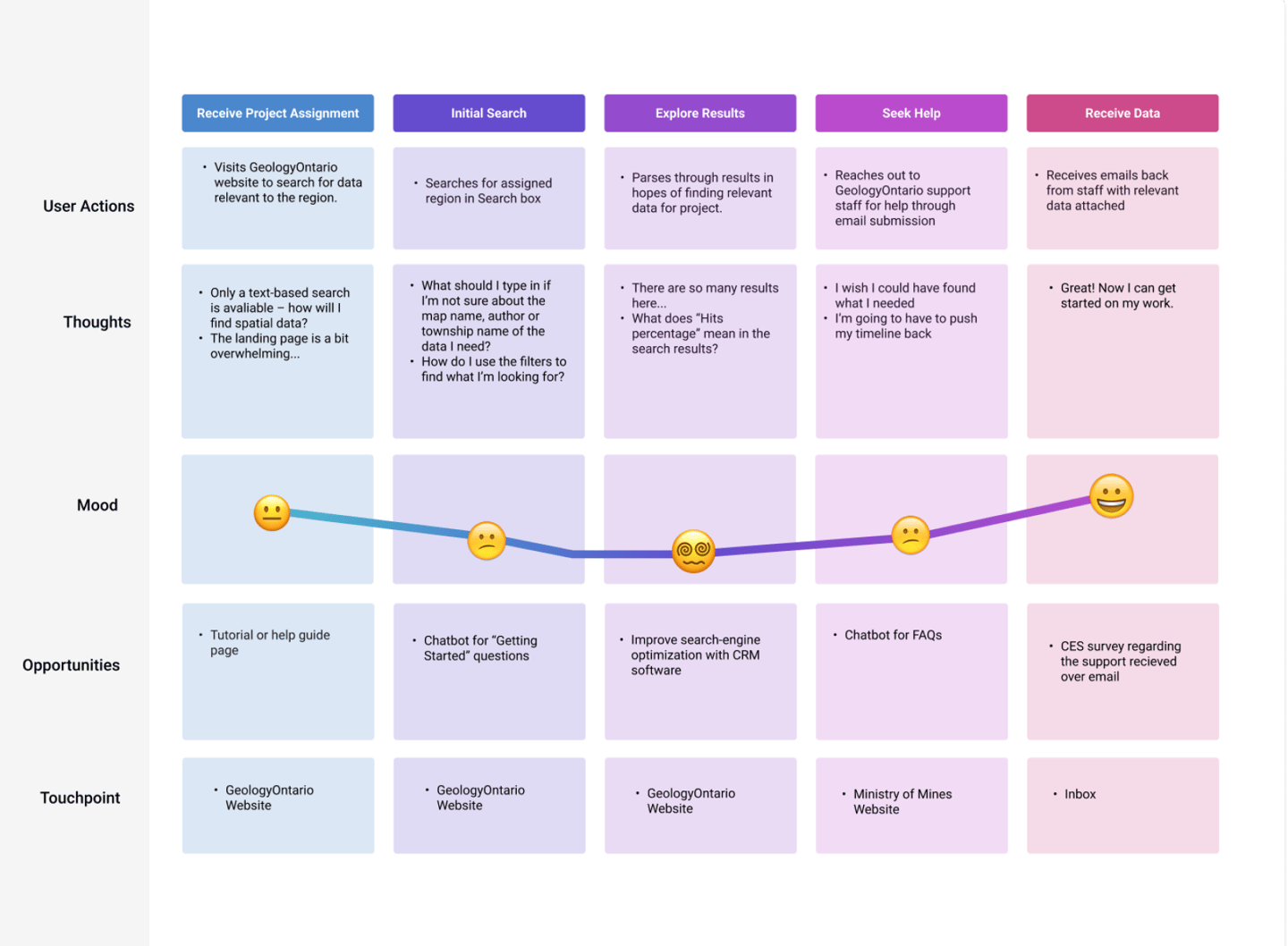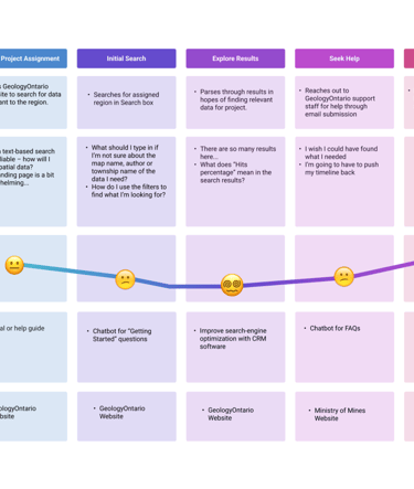 Based on existing user research data collected from earlier research, I developed a customer journey map that outlined the existing user journey for users of the old GeologyOntario website.