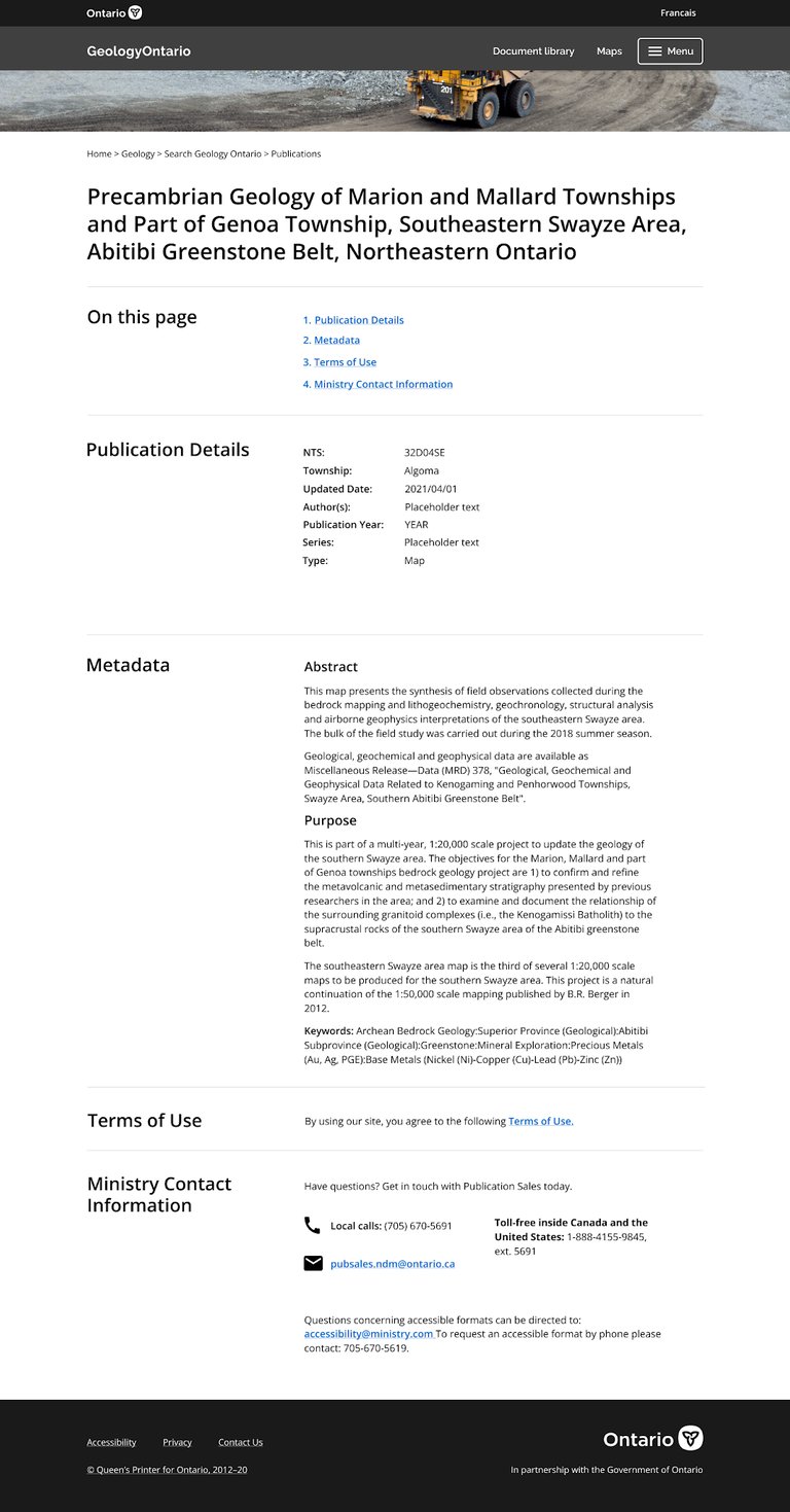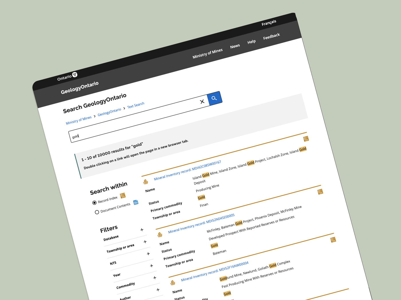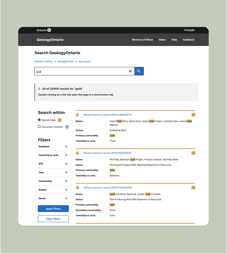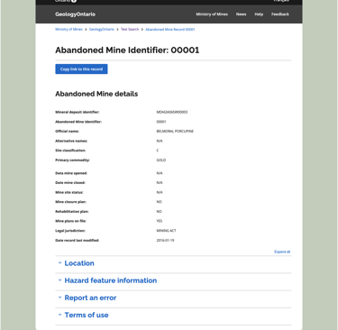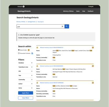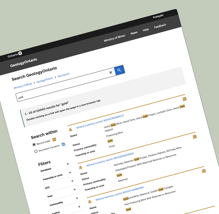 The GeologyOntario project was developed with the objective to create a new internet data discovery site for the Mines and Minerals Division (MMD) to allow clients such as Geoscientists, and Consultants to search, discover and access MMD geoscience information. At the time of the project, the existing website to access geoscience data had maintained its interface as designed in the early 2000s.
