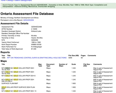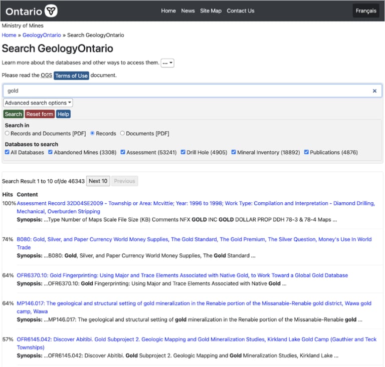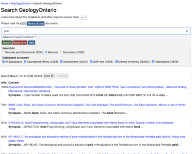 An opened search result page on the previous GeologyOntario website.